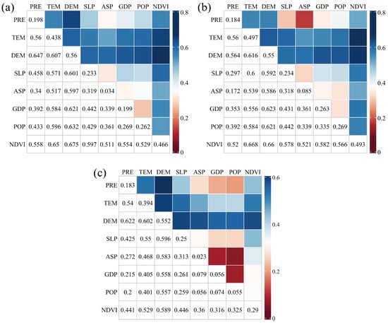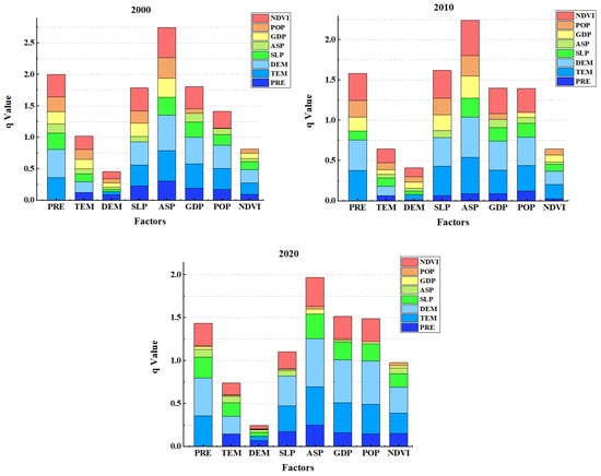 The influence of different factors exhibited certain temporal variation patterns. The q values of TEM and NDVI increased during 2000–2010, reaching a peak in 2010, and then decreased slightly by 2020. SLP and ASP showed slight upward and downward trends, respectively, during 2010–2020. From 2000 to 2020, the q value of GDP continued to rise, whereas the q values of DEM, POP, and PRE remained relatively stable.