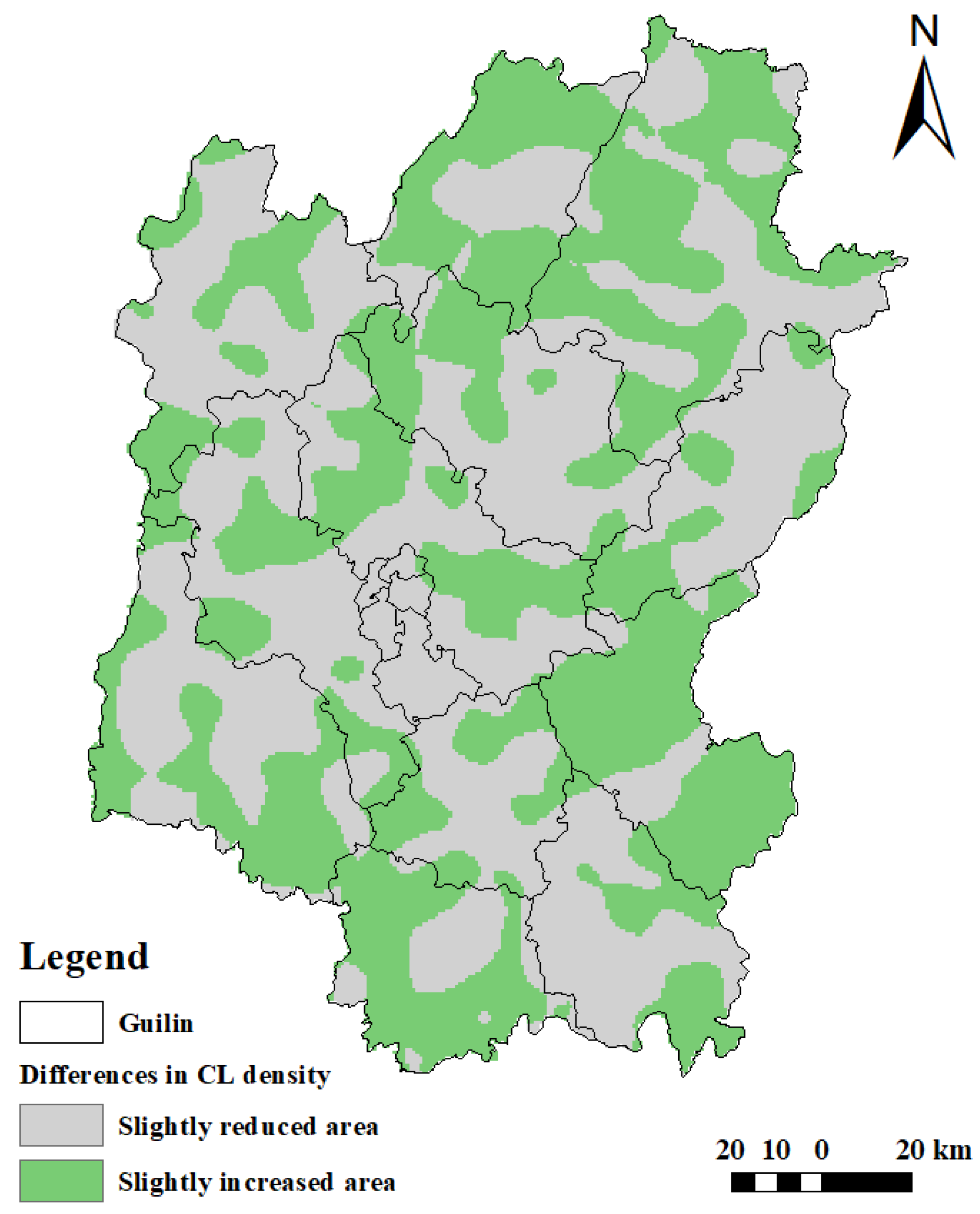- CL continued to decrease in area with reduced spatial aggregation. Over the study period, the total CL area in Guilin decreased by 105.30 km2, with an annual change rate of −0.20%. Spatially, CL showed a general pattern of more in the southeast, less in the northwest, but the extent of high-density areas shrank significantly and fragmentation intensified. The loss was mainly due to conversion to construction land and forest land, particularly during 2010–2020.