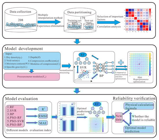 Since the construction of large-scale hydropower projects in the southwest region, the impact of deep overburden on the construction process of high earth-rock dams has become increasingly significant. In order to deeply study the mechanical properties of deep overburden soil, the use of in situ testing technology can effectively reduce the disturbance effects on the soil mass, especially sandy soil, and can reflect the in situ mechanical behavior of the soil more accurately than laboratory tests. The pressuremeter test, as a key in situ testing method, can obtain critical parameters such as in situ horizontal stress of soil mass, undrained shear strength, and the pressuremeter modulus. The pressuremeter modulus is the deformation modulus in the horizontal direction, which can effectively reflect the in situ stress history and structural strength characteristics of the soil mass. It is of great significance for predicting the settlement of deep overburden soil mass and designing horizontally loaded structures. In order to explore the relationship between the pressuremeter modulus of the ultra-deep overburden fine sand layer and its physical and mechanical indicators in a proposed hydropower station in Southwest China, this paper proposes a method based on data-driven models and physical mechanisms for prediction and reliability analysis. Figure 1 shows the main flow of the study, which mainly includes four core steps: the establishment of the database, the construction of machine learning models, the application and comparison of different models, and the reliability verification of the physical mechanism.