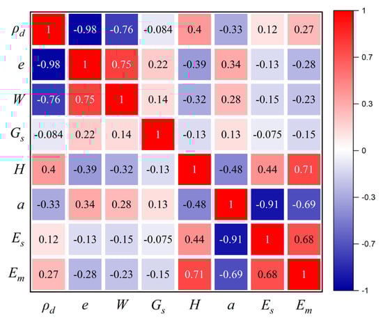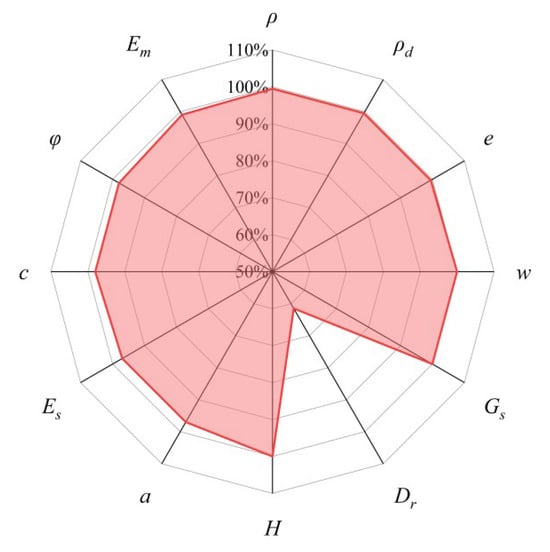 Figure 5 presents the multivariate joint distribution map of various geotechnical parameters after screening, which displays the correlation and Pearson correlation coefficient among various geotechnical parameters in a manner of data visualization. When the correlation between datasets is very strong, the Pearson correlation coefficient r is ±0.81–±1, and similarly, the correlation coefficients for strong, moderate, and weak correlations between datasets are ±0.61–±0.8, ±0.41–±0.6, and ±0.21–±0.4, respectively; it can be seen from the figure that the distribution structure of all parameters is relatively concentrated. There is a strong correlation between dry density and void ratio (r = 0.98), and a strong correlation between compression coefficient and compression modulus (r = −0.91). This also indicates that the void ratio has a certain determining effect on the dry density, and the compression coefficient has a certain determining effect on the compression modulus. These parameters can be calculated by traditional calculation formulas and also reflect a strong correlation. In addition, there is a strong positive correlation between wet density and moisture content (r = 0.65) and a strong negative correlation between dry density and moisture content (r = −0.75). Moreover, there is a strong positive correlation between void ratio and moisture content (r = 0.75). Although there is a certain correlation between the remaining parameters (except for the pressuremeter modulus), they are all either moderately correlated or weakly correlated.