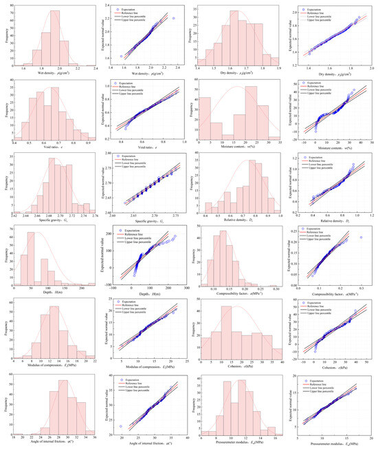 Histograms of soil layer parameters and corresponding Q-Q plots.