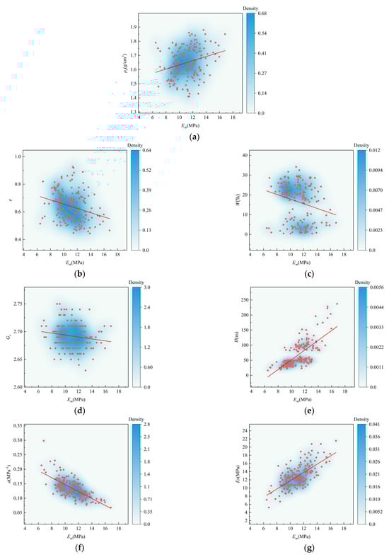 To further analyze the correlation between individual input parameters and the output parameter, the pressuremeter modulus, a Pearson correlation coefficient heatmap was used for analysis and visualization. Figure 6 shows the correlation coefficient between the input parameters and the pressuremeter modulus, and it can be found that the results shown in the joint distribution diagram of multi-variables in the previous paper are not very different. Table 2 shows the significance p-value of the correlation coefficient between each input variable and the pressuremeter modulus. It can be found that the p-values are all less than 0.05 overall, indicating that the correlation coefficient between the input variables and the pressuremeter modulus is of certain significance. Figure 7 is the kernel density map between input variables and output variables, and it can be found that these input variables show a certain correlation with the pressuremeter modulus on the whole. The kernel density plots can better present the distribution pattern and range of these variables, providing insights into their potential influence on the pressuremeter modulus. Figure 7a shows that the dry density is mainly concentrated in 1.55–1.75 g/cm3, and it has a positive correlation with the pressuremeter modulus, and the pressuremeter modulus gradually increases as the dry density increases. Figure 7b shows that the void ratio is mainly concentrated in the range of 0.5–0.7 and is negatively correlated with the pressuremeter modulus. The modulus decreases gradually with the increase in the void ratio, which may be attributed to the fact that as the void ratio increases, the arrangement of particles to particles is looser, and the contact points are less, further causing the mechanical properties to decay. Figure 7c shows that the moisture content is mainly concentrated in the range of 15–30%, and it presents a negative correlation with the pressuremeter modulus. As the moisture content increases, the pressuremeter modulus gradually decreases. This may be attributed to the fact that at lower moisture contents, capillary tension occurs between particles, reducing the lubrication effect and improving the overall mechanical properties. Figure 7d shows that the specific gravity is mainly concentrated in the range of 2.65–2.70, and it has a certain negative correlation with the pressuremeter modulus. Figure 7e shows that the depth is mainly concentrated in the range of 0–150 m, and it has a certain positive correlation with the pressuremeter modulus. The pressuremeter modulus gradually increases as the depth increases, which may be attributed to the fact that as the depth increases in the same soil layer, the soil body as a whole is denser, and its deformation under the same pressure is smaller, making the mechanical properties better. Figure 7f shows that the compression coefficient is mainly concentrated in 0.10–0.15, which is negatively correlated with the pressuremeter modulus, and the pressuremeter modulus decreases gradually with the increase in the compression coefficient. Figure 7g shows that the compression modulus is mainly concentrated in the range of 5–16 MPa, and it has a strong positive correlation with the pressuremeter modulus. As the compression modulus increases, the pressuremeter modulus gradually increases. This may be attributed to the fact that the pressuremeter modulus comprehensively reflects the different performance of soil layers under tension and compression. Furthermore, for soil layers with little difference in mechanical properties between the vertical and horizontal directions, the gap between the pressuremeter modulus and the compression modulus is not significant, so the compression modulus has a certain influence on the pressuremeter modulus.