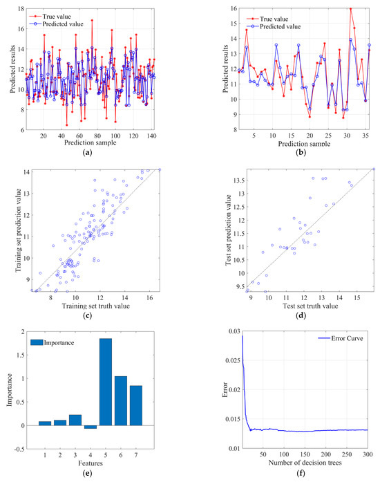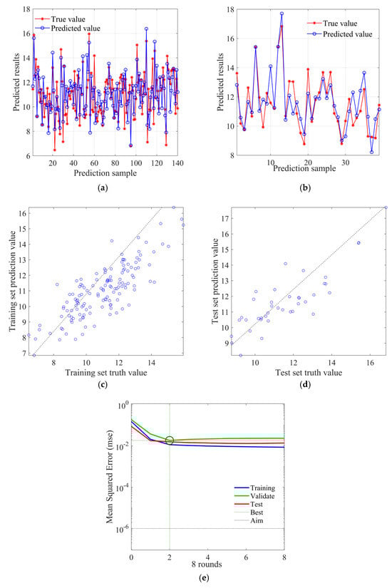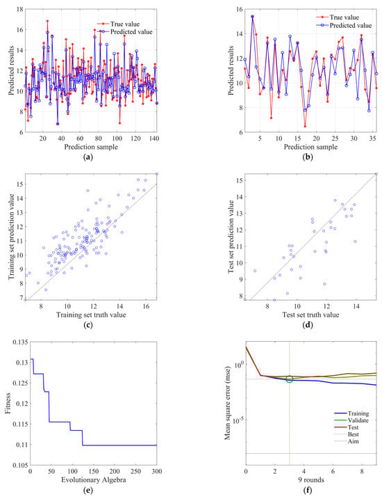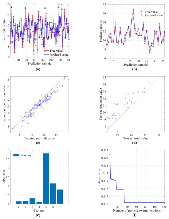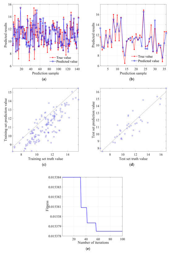 Figure 15a and Figure 15b, respectively, show the fit between predicted and true values in the training set and test set, and it can be found that the overall fitness is close to the BP neural network model. Figure 15c and Figure 15d, respectively, display the scatter distribution of predicted values in the training set and the test set. It can be observed that the deviation of predicted values in the training set is relatively more concentrated compared to the BP neural network model, while the degree of deviation in the test set is not significantly different from the BP neural network model. Figure 15e shows the decrease in fitness value (root mean square error) with the increase in population iteration times, where each iteration updates the weight only when the error of the validation set is less than or equal to the previous error, and the fitness value (root mean square error) basically converges at around 125 times. Figure 15f shows the change curve of mean absolute error with the training rounds, which can find that the best training round is three times, and the error value reaches 0.0458, and its subsequent curve changes smoothly.