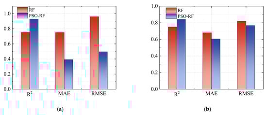 Comparison of prediction evaluation indicators between RF and PSO-RF for training and test datasets: (a) training dataset; (b) test dataset.