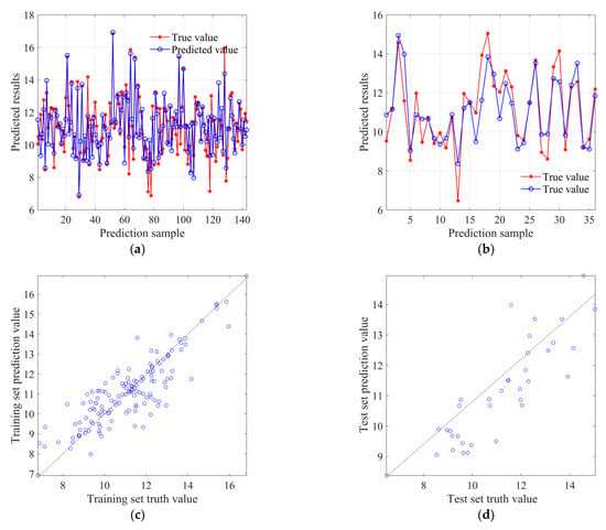Figure 11 shows the prediction results of the SVR model. The penalty coefficient C and kernel parameter g of the model were set to 4.0 and 0.8, respectively. Figure 11a and Figure 11b, respectively, show the degree of coincidence between predicted and true values in the training set and test set. It can be observed that the deviation of predicted values in both the training and test sets is relatively small, demonstrating a certain predictive performance overall. Figure 11c and Figure 11d, respectively, display the scatter distribution of predicted values for the training set and test set. It can be observed that the deviation of predicted values for both the training and test sets has increased compared to the RF model, and overall, its predictive performance has declined.