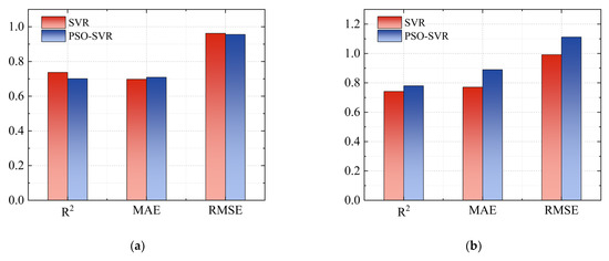 Comparison of prediction evaluation indicators between SVR and PSO-SVR for training and test datasets: (a) training dataset; (b) test dataset.