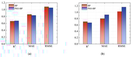 Comparison of prediction evaluation indicators between BP and PSO-BP for training and test datasets: (a) training dataset; (b) test dataset.
