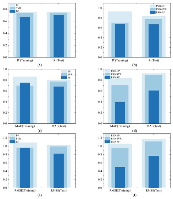 - After optimizing the hyperparameters of Random Forest (RF), Support Vector Machine (SVR), and BP Neural Network using Particle Swarm Optimization (PSO), the predictive performance of Random Forest (RF) and Support Vector Machine (SVR) improved, while the overall changes in the BP Neural Network were not significant. Among them, the Random Forest model exhibited the most comprehensive predictive performance after hyperparameter optimization. In the training set, its R2, MAE, and RMSE were 0.930, 0.392, and 0.496, respectively. In the test set, its R2, MAE, and RMSE were 0.840, 0.606, and 0.767, respectively.