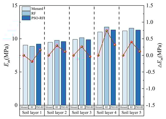Figure 18 and Table 6 display the comparison of prediction results through Menard’s calculation formula, the RF model, and the PSO-RF model under the setting of α = 0.33. It can be found that, with the calculation results proposed by Menard as the benchmark values, both the RF model and PSO-RF model demonstrate a good level of reliability. Among them, the RMSE of RF is 0.422, R2 is 0.752, while the RMSE of PSO-RF is 0.173, and R2 is 0.958. By comparison, it can be found that the predicted pressuremeter modulus of PSO-RF for these five groups of soils is closer to the results calculated by the Menard formula, and the prediction error is relatively small, which can be attributed to the significant optimization effect of the particle swarm algorithm on the hyperparameters of the RF model. Through the Pearson correlation coefficient r, it can be found that the predicted values of both models have a high correlation with the results calculated using the formula proposed by Menard, reaching 98.8 and 99.3, respectively. Moreover, the p-values are both much less than 0.05, indicating that the correlation coefficients are statistically significant. This indicates that the predictions of the two models within a depth of 100 are reliable on the whole.