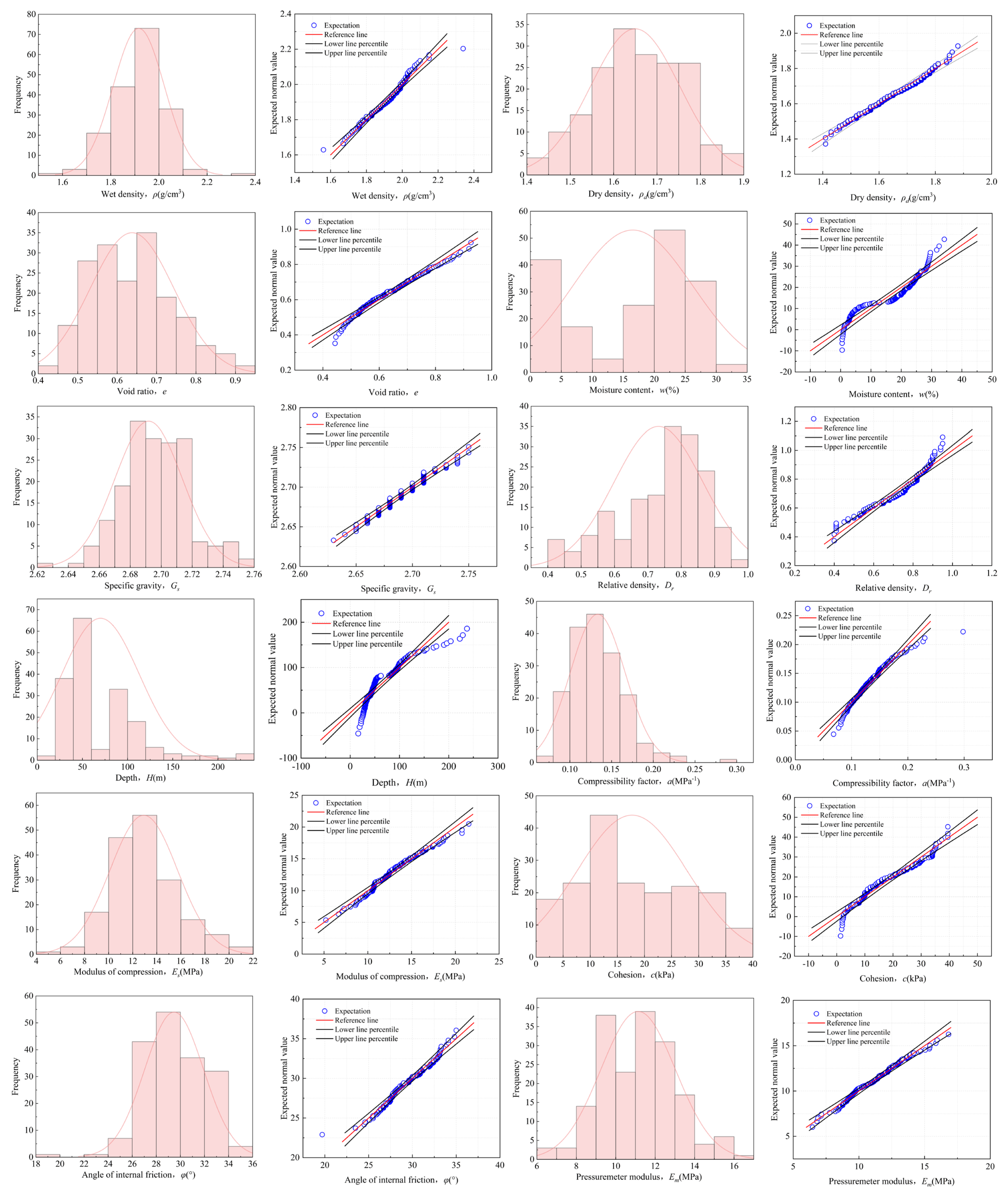 Figure 4 shows the histograms of the distributions of each parameter and the corresponding Q-Q plots for this soil layer. It can be found that the data scatter of the remaining parameters, except for the depth and moisture content, basically follows the distribution along the diagonal line, indicating that it basically conforms to the approximately normal distribution. The histogram further shows that the data distribution of the depth parameter is relatively concentrated, while the moisture content is relatively dispersed due to the thick covering soil layer, with the moisture content of the soil body at different positions being mainly concentrated in the interval of about 25%. Based on the data shown in
