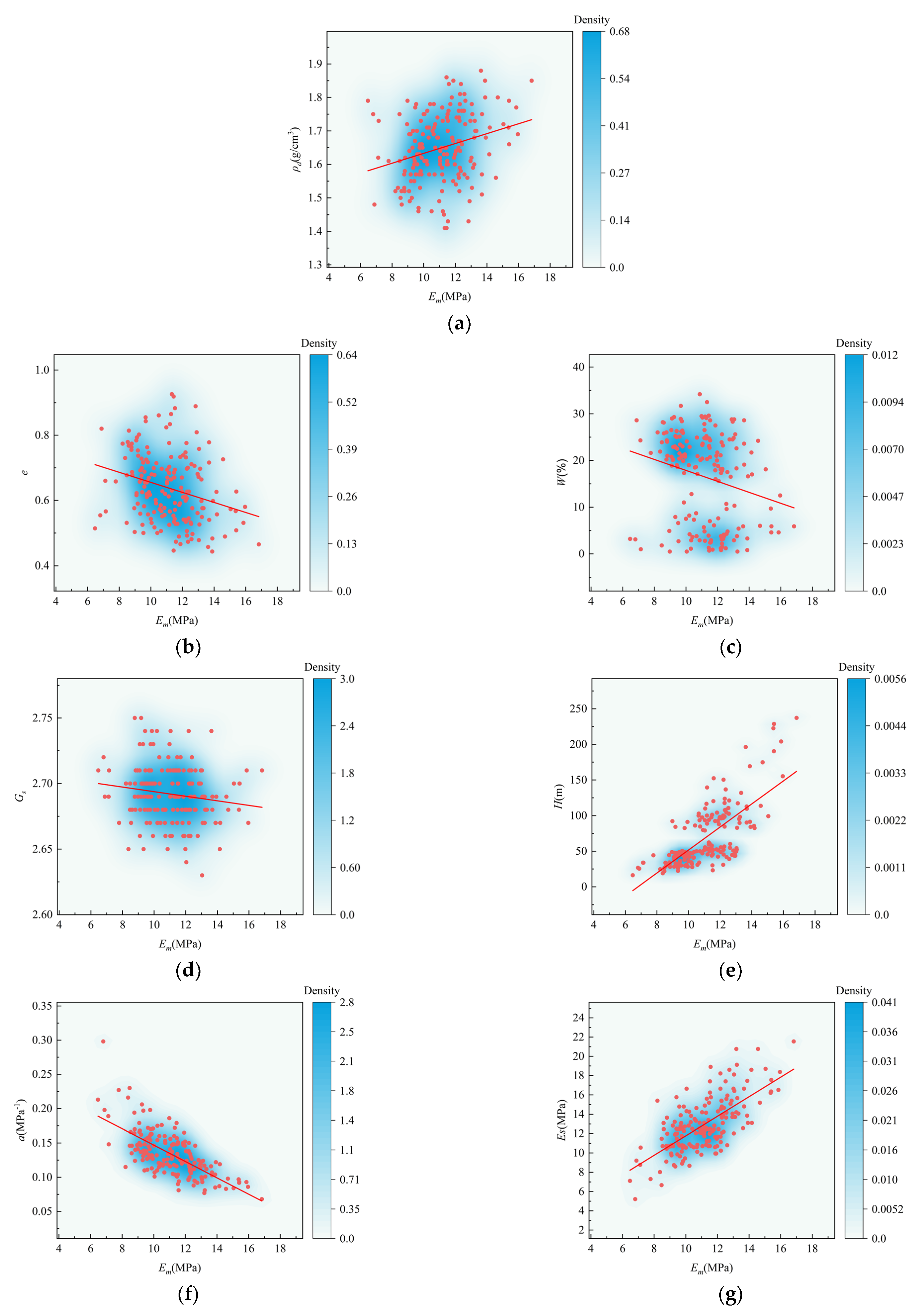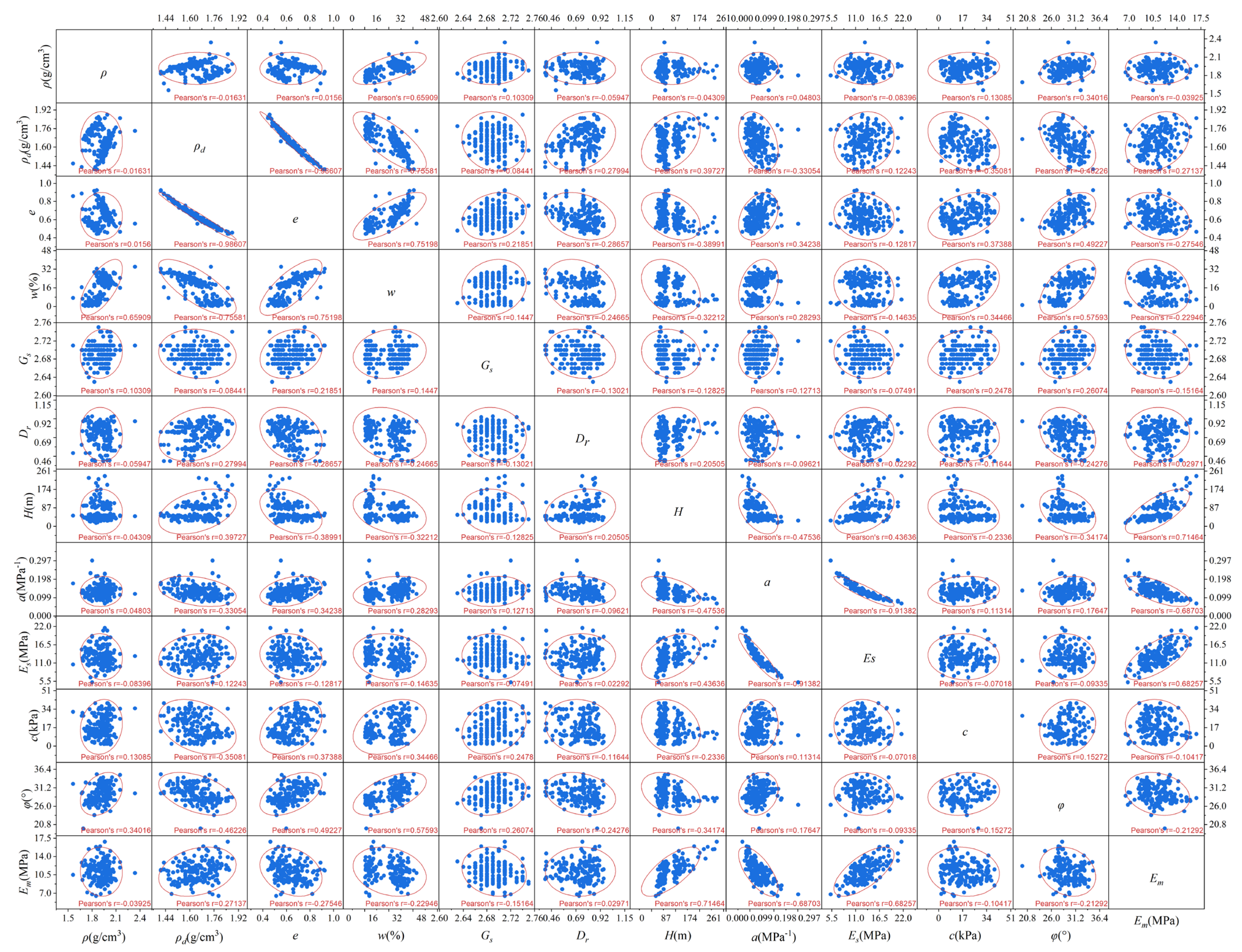 r = −0.91). This also indicates that the void ratio has a certain determining effect on the dry density, and the compression coefficient has a certain determining effect on the compression modulus. These parameters can be calculated by traditional calculation formulas and also reflect a strong correlation. In addition, there is a strong positive correlation between wet density and moisture content (