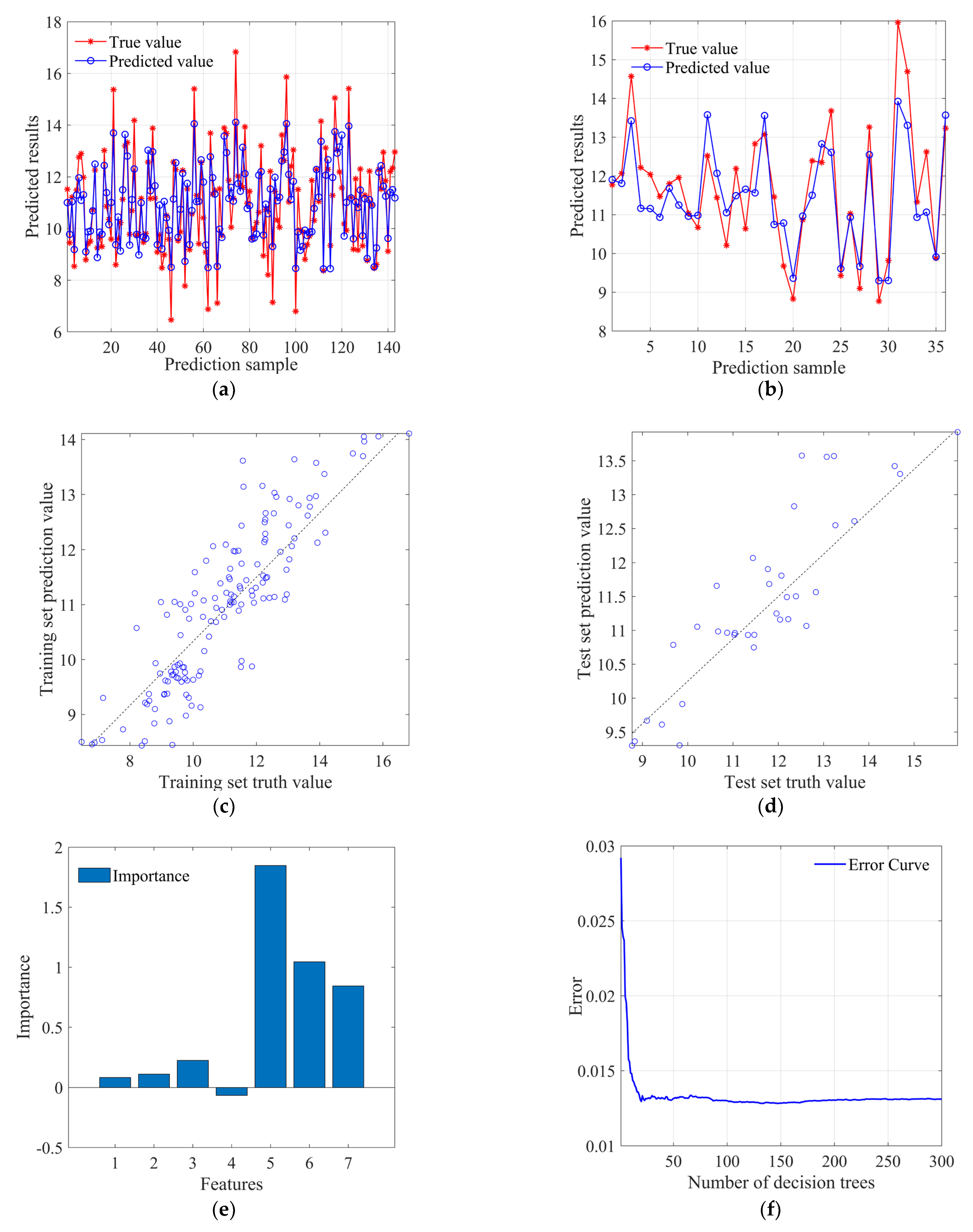 Figure 14d, respectively, display the scatter distribution of predicted values for the training set and test set. It can be observed that the deviation of the predicted values from the ideal prediction line for both the training and test sets has increased compared to the RF and SVR models. Overall, there has been a decline in its predictive performance.