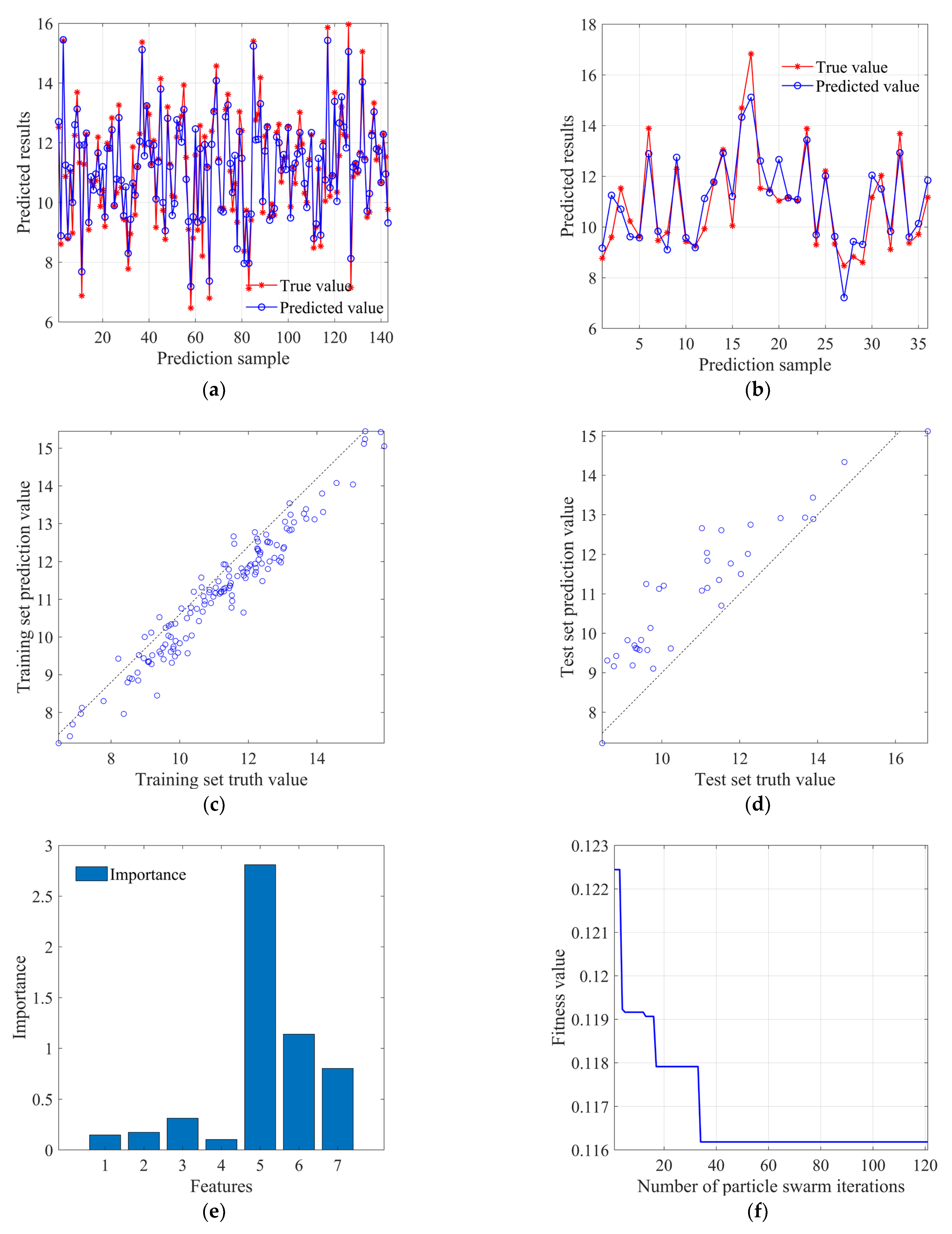 Figure 15b, respectively, show the fit between predicted and true values in the training set and test set, and it can be found that the overall fitness is close to the BP neural network model.