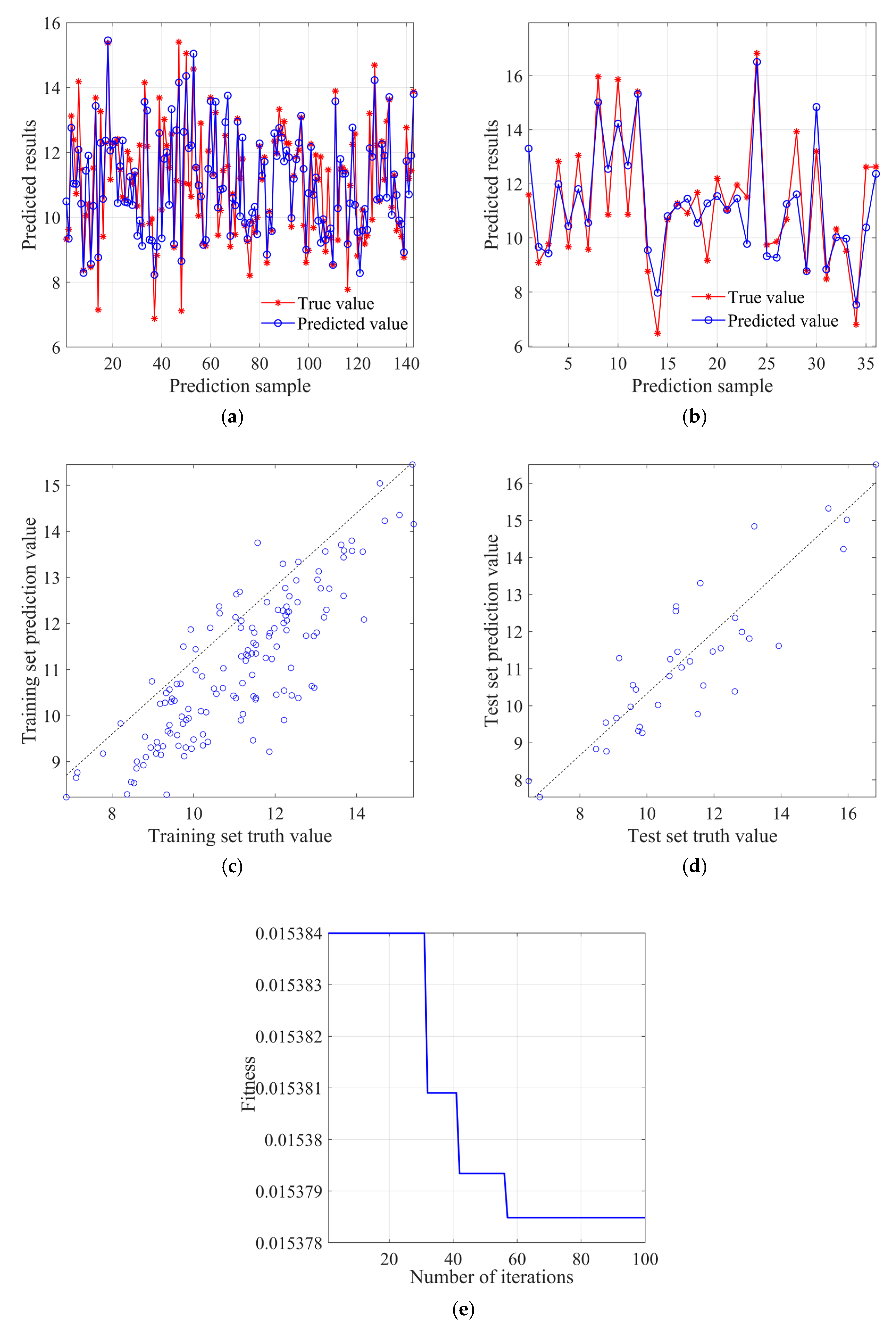 Figure 15e shows the decrease in fitness value (root mean square error) with the increase in population iteration times, where each iteration updates the weight only when the error of the validation set is less than or equal to the previous error, and the fitness value (root mean square error) basically converges at around 125 times.
