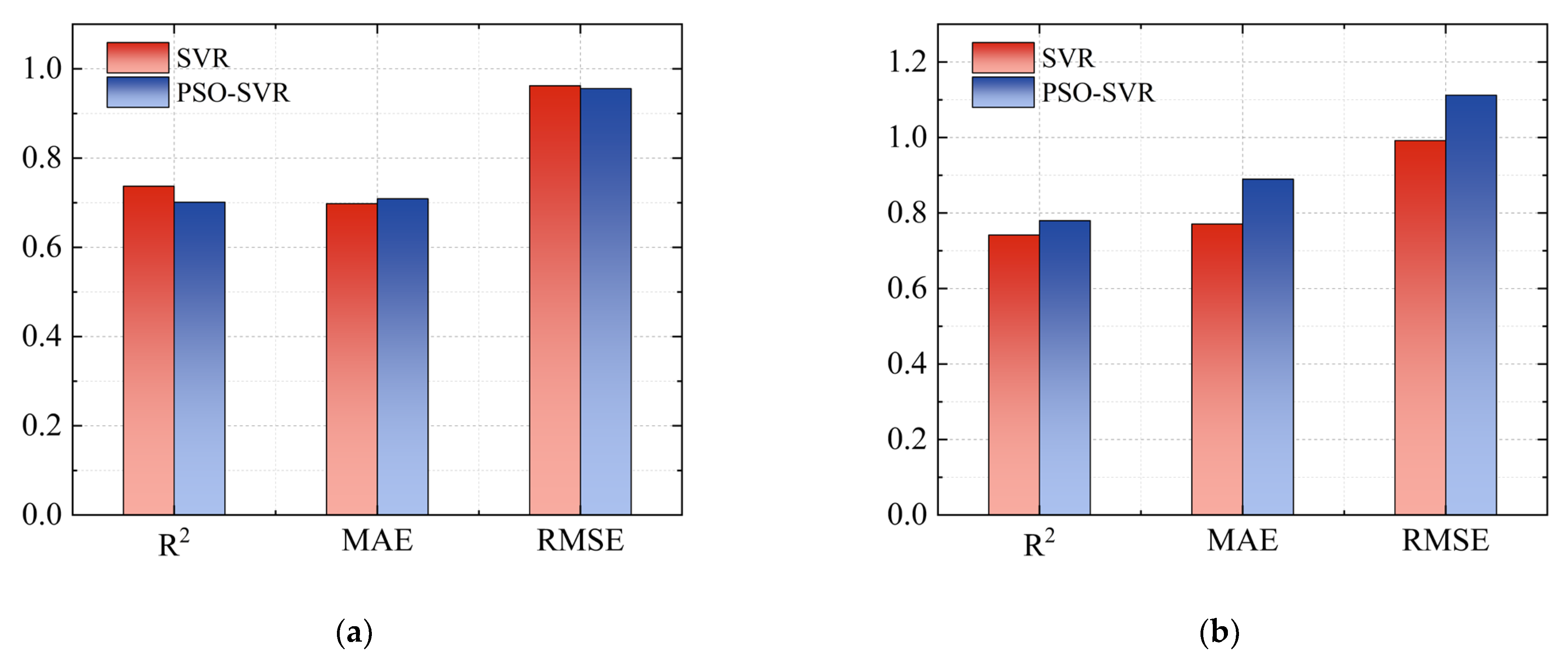 2 of the test set is higher than that of the training set, indicating that the models have good generalization capabilities. They are strong in predicting new data and possess a certain reliability for regression prediction under multi-feature factors. In addition, the MAE of SVR model training set and test set were 0.698 and 0.771, respectively, while that of PSO-SVR model training set and test set were 0.709 and 0.890, respectively. The RMSE of SVR model training set and test set were 0.962 and 0.992, while those of PSO-SVR model were 0.956 and 1.112. Based on the results of MAE and RMSE, it can be observed that after optimizing the hyperparameters of the SVR model through the particle swarm algorithm, the prediction error has relatively improved. This indicates that the validation model has overfitted the training data and exhibits a certain task dependency.