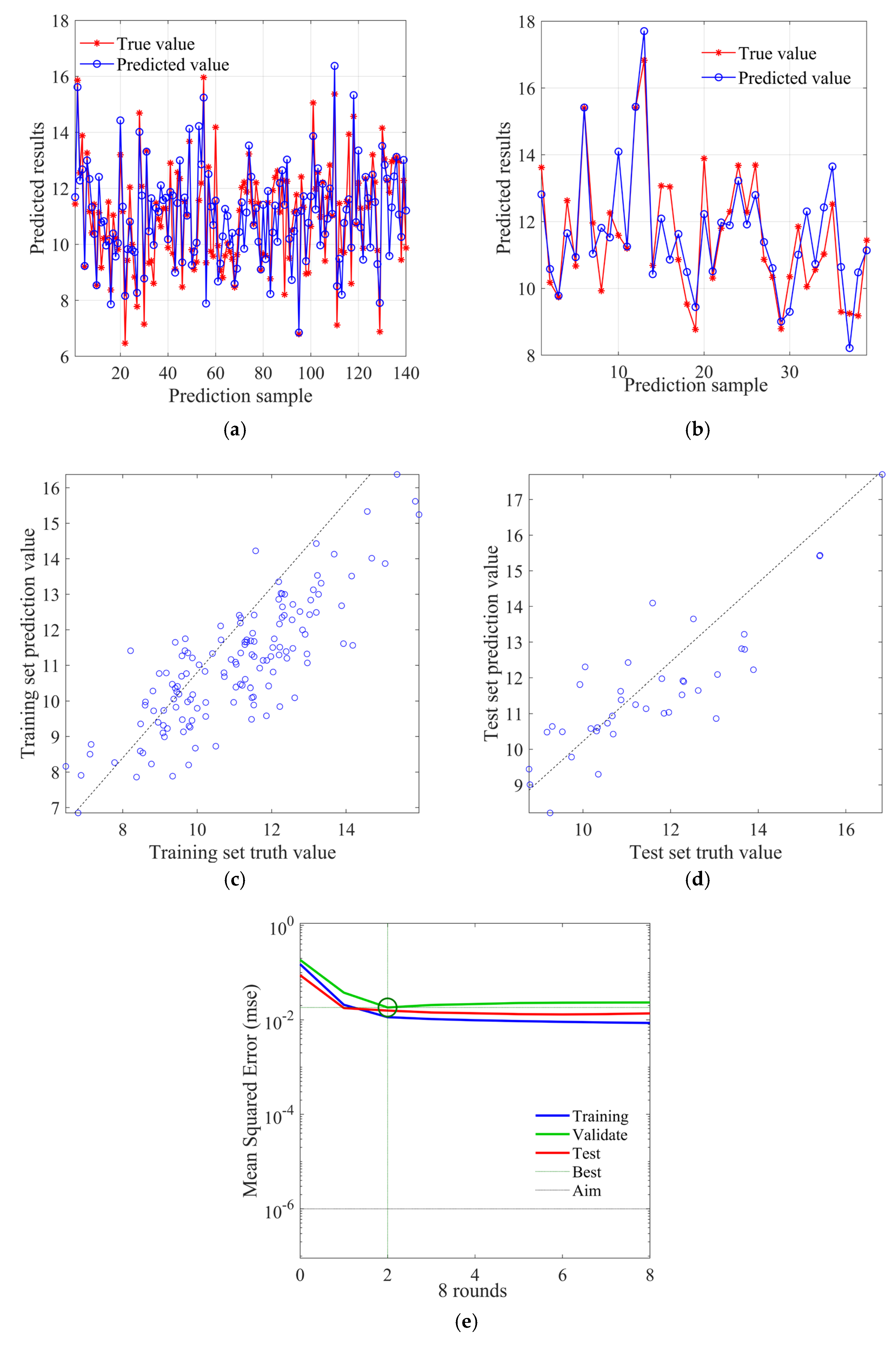Figure 14e shows the change curve of mean absolute error with the number of training rounds, and it can be found that the optimal training round is twice, with an error value of 0.0182, and its subsequent curve changes are relatively stable.