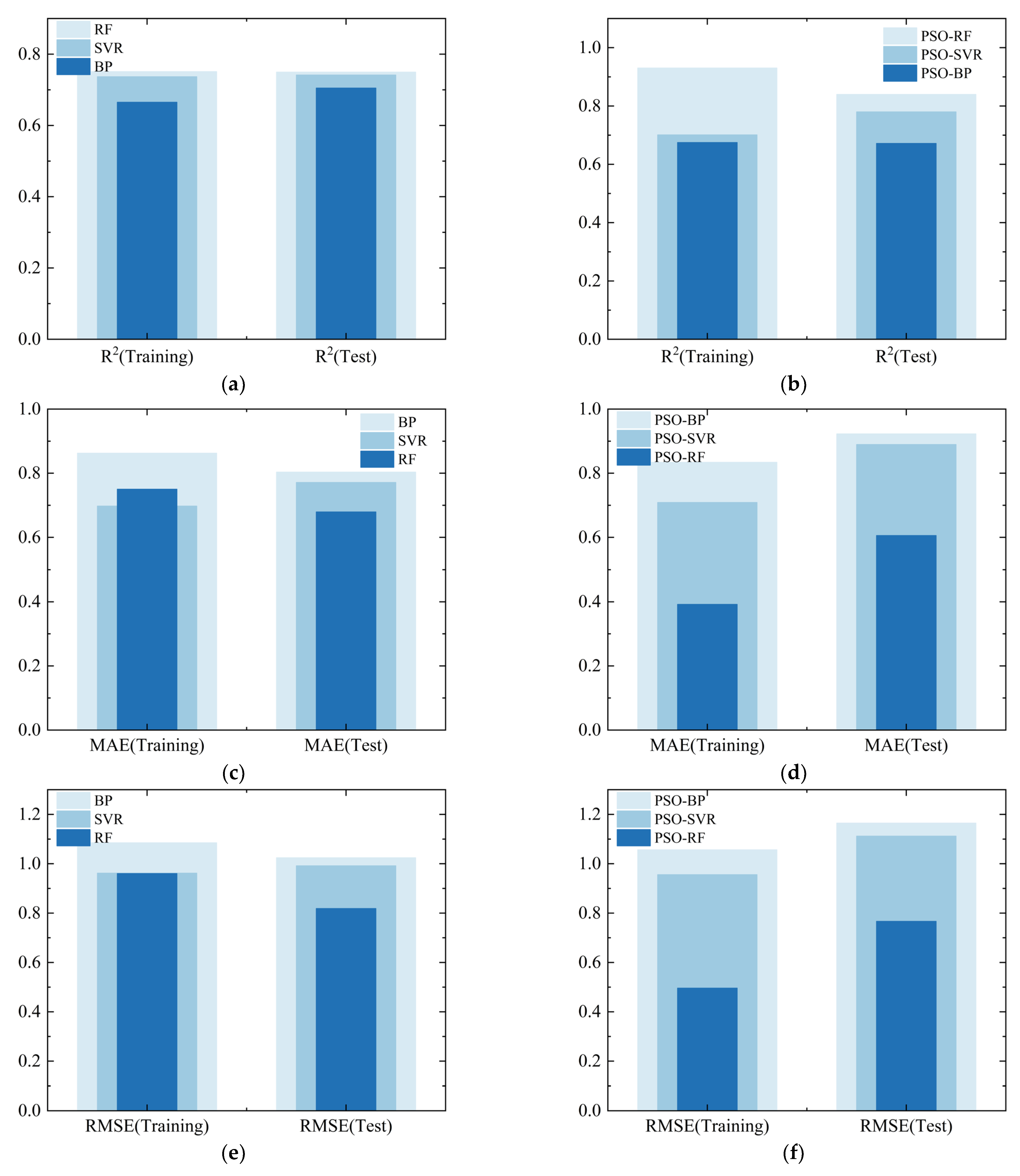 Figure 17e display the comparison of evaluation indicators for the RF model, SVR model, and BP neural network model, respectively. It can be observed that the RF model exhibits the best predictive performance overall. In the predictions on the training set, its R