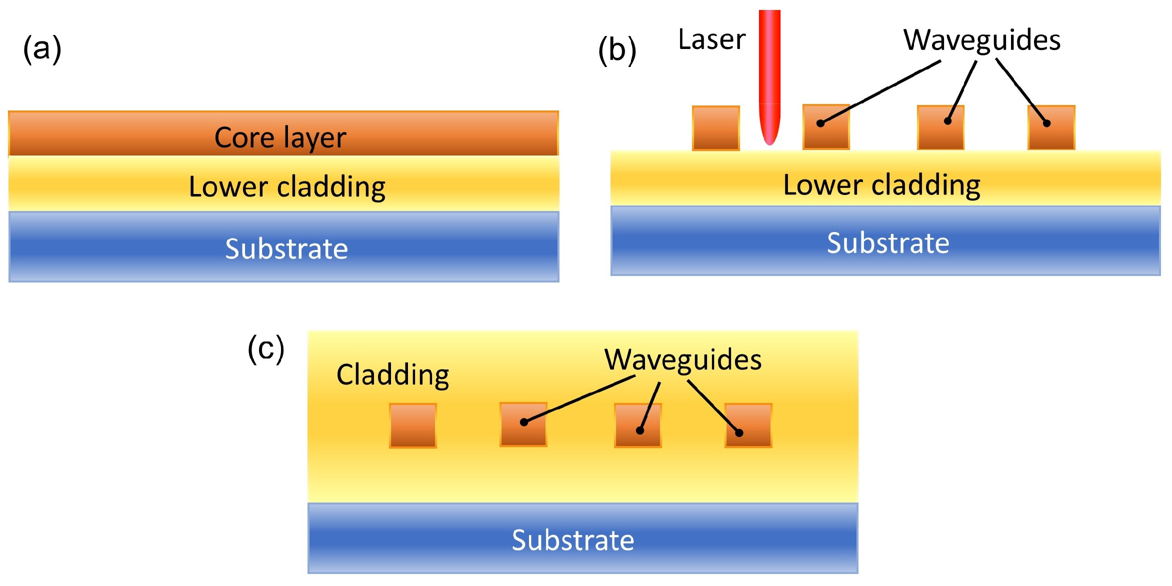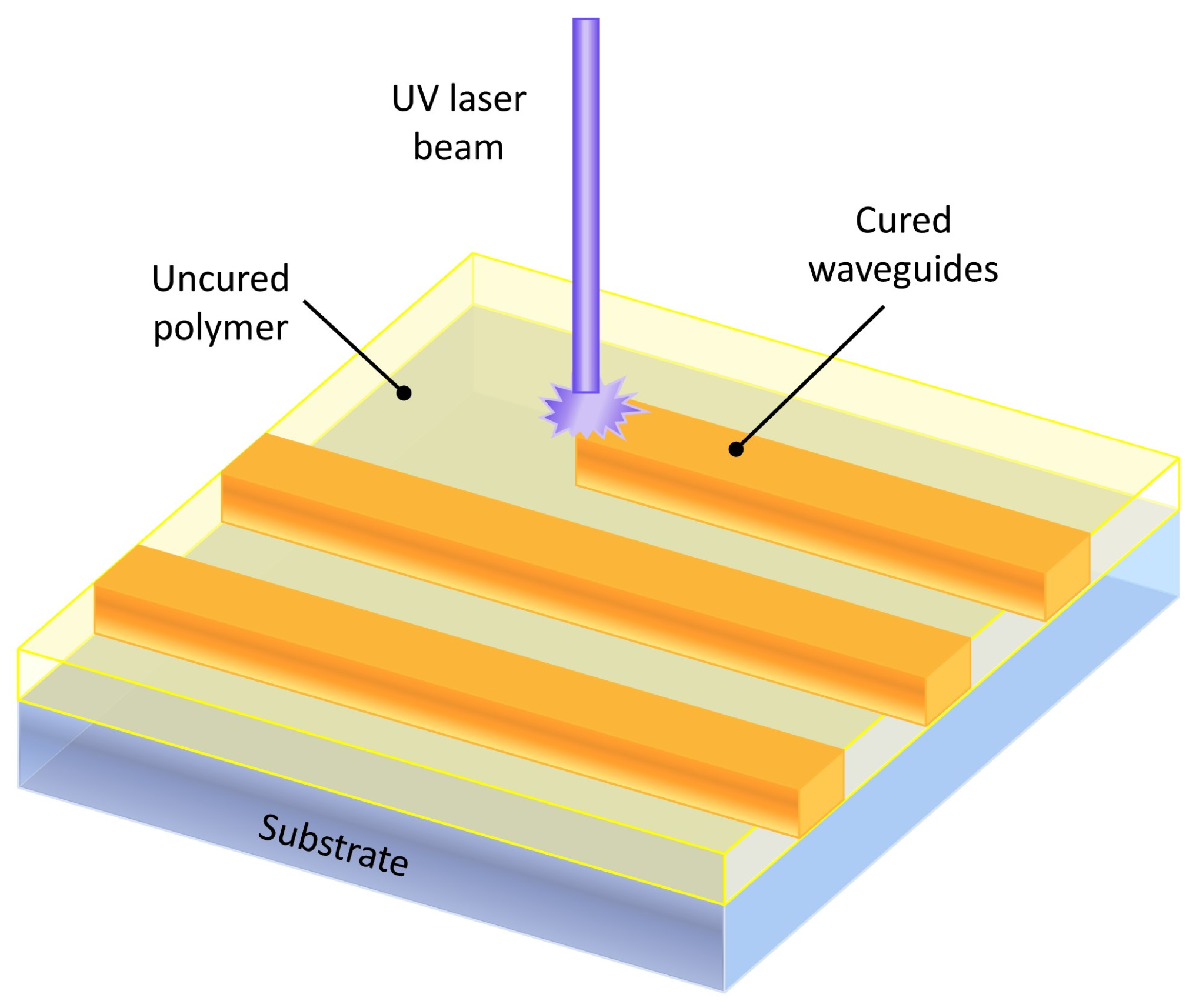 | Direct ink writing | PDMS/PMMA/PDMS | 175 × 55 | MM | 0.21 (λ = 980 nm), 0.42 (λ = 1.31 μm), 1.08 (λ = 1.55 μm) | [129] |