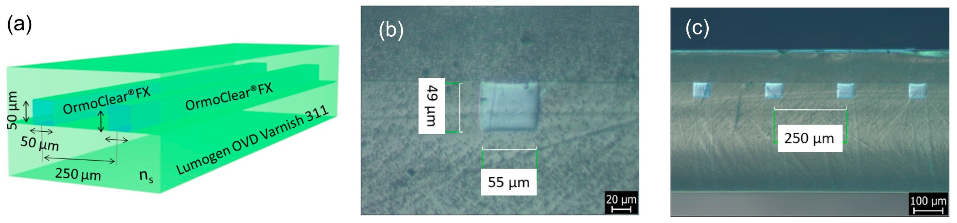 - Date, K.; Fukagata, K.; Ishigure, T. Core Position Alignment in Polymer Optical Waveguides Fabricated Using the Mosquito Method. Opt. Express 2018, 26, 15632–15641. [Google Scholar] [CrossRef]
