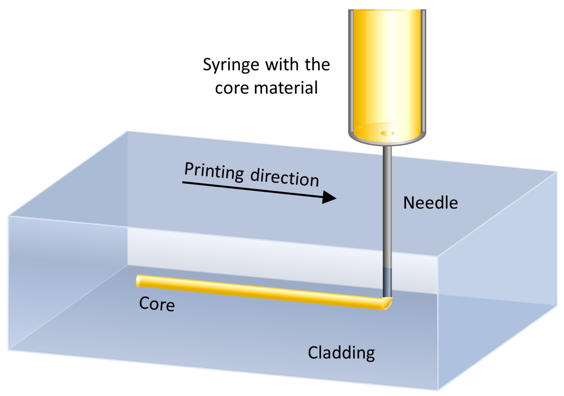 - Lin, C.; Lin, C.; Lin, C.; Jia, X.; Chen, C.; Yang, C.; Li, X.; Li, X.; Li, X.; Shao, M.; et al. Direct Ink Writing 3D-Printed Optical Waveguides for Multi-Layer Interconnect. Opt. Express 2023, 31, 11913–11922. [Google Scholar] [CrossRef]