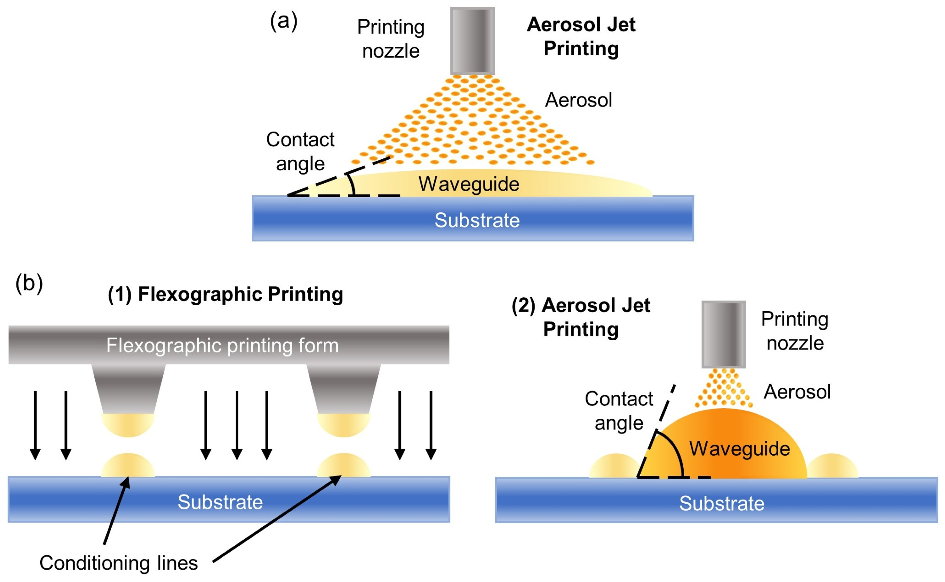 - Reitberger, T.; Hoerber, J.; Schramm, R.; Sennefelder, S.; Franke, J. Aerosol Jet® Printing of Optical Waveguides. In Proceedings of the 2015 38th International Spring Seminar on Electronics Technology (ISSE), Eger, Hungary, 6–10 May 2015; pp. 5–10. [Google Scholar] [CrossRef]