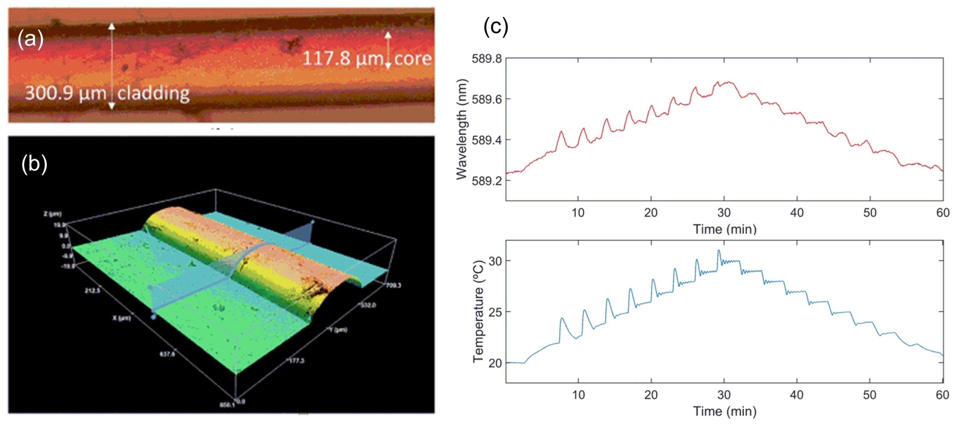 - Davila, R.B.; Matias, I.R.; Zabala, S.; Socorro-Leranoz, A.B.; Rivero, P.J.; Corres, J.M. Printed Optical Waveguide Temperature Sensor With Rhodamine-Doped Core. IEEE Sens. Lett. 2024, 8, 1–4. [Google Scholar] [CrossRef]