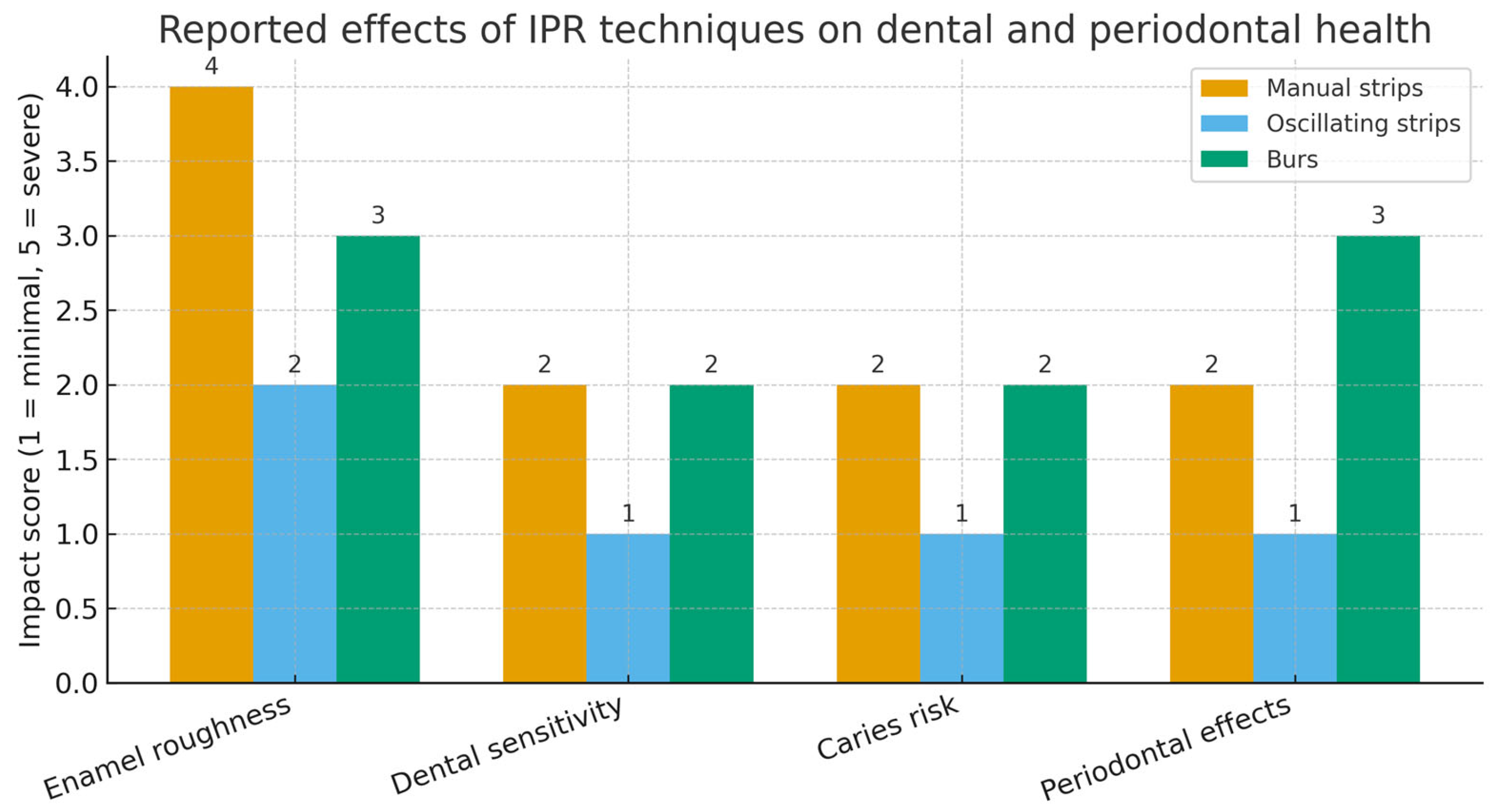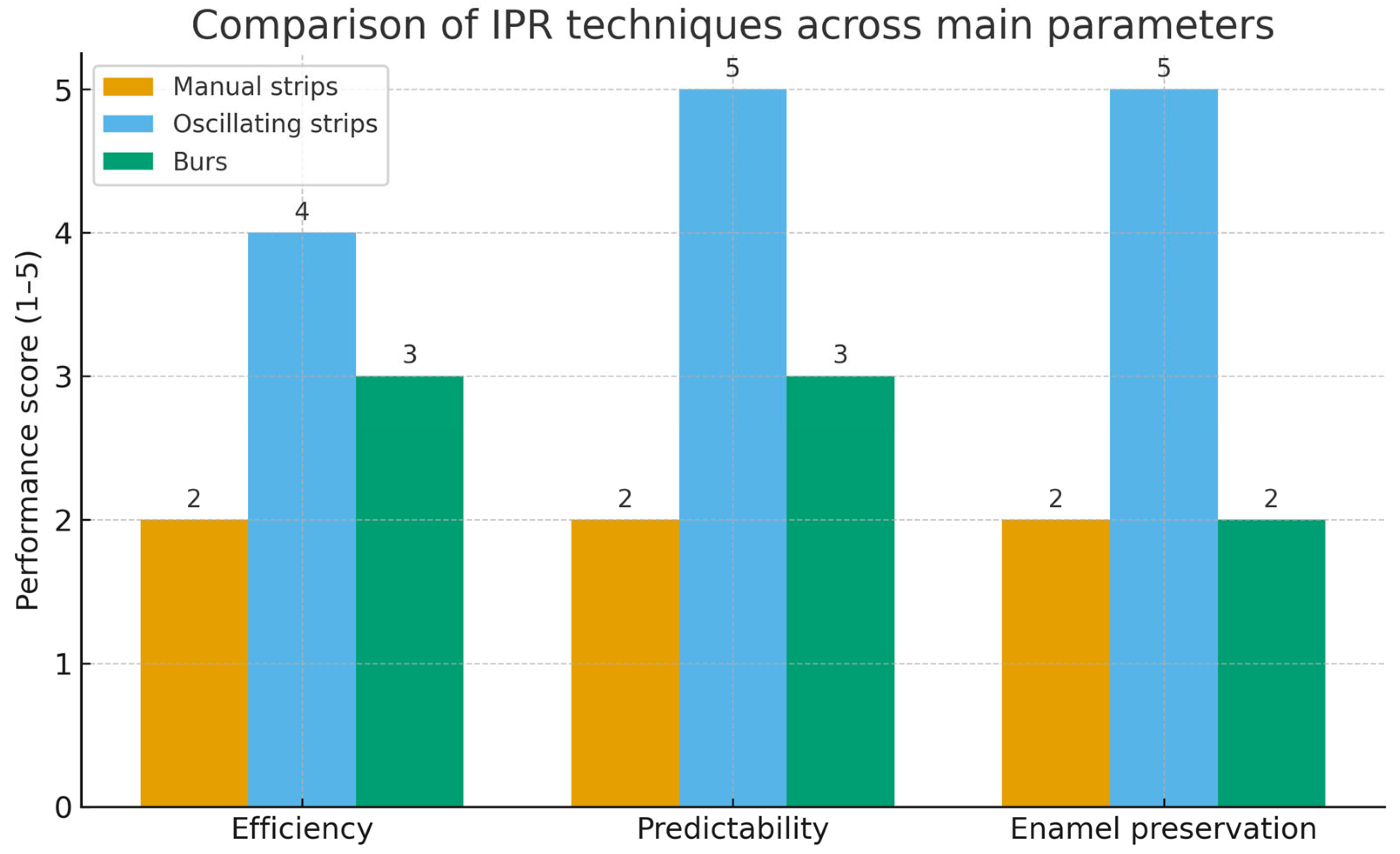 Gazzani et al., 2019 [6] | In vitro study; 20 human extracted premolars | Group 1: mechanical oscillating strips Group 2: manual strips | Surface roughness (Ra) before and after IPR; effectiveness in enamel removal | G1 showed lower surface roughness after IPR. Oscillating strips removed enamel more efficiently and produced smoother surfaces | Oscillating strips appeared more efficient in enamel reduction and produced smoother surfaces compared to manual strips. Oscillating strips may be more effective for IPR procedures in terms of enamel removal. |