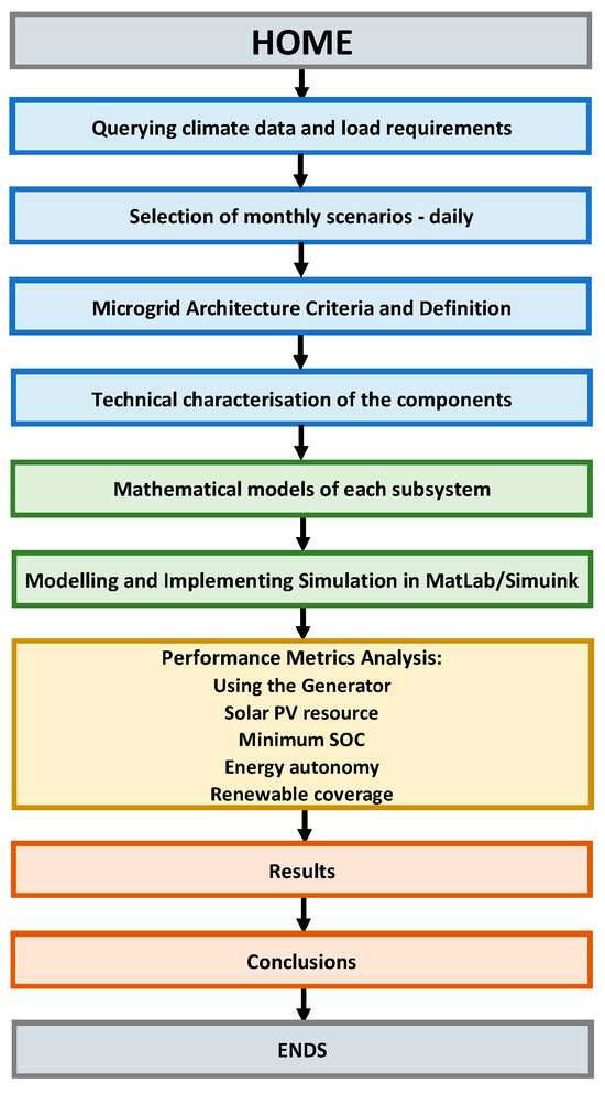 The methodology established for the development of the study is based on a procedure for modelling and simulating a hybrid microgrid composed of photovoltaic generation, a biomass-based system, and a battery energy storage system. This approach seeks to ensure energy autonomy in non-interconnected rural communities, integrating real climate data, load profiles, and specific technical parameters for each component of the system. The methodology ranges from the collection of reference information to the implementation of mathematical models and their simulation in MATLAB/Simulink. The stages developed are summarised in Figure 1, which presents the general flowchart of the methodology used.
