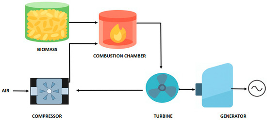 This section presents the modelling of a power plant based on a gas turbine fuelled by agricultural biomass. Figure 2 illustrates the general layout of an open-loop gas turbine power plant, highlighting the fuel system, the compressor, the combustion chamber, the turbine, and the electric generator. Each of these subsystems is described using specific mathematical models which allow for detailed thermodynamic dynamics, energy balances, flow and pressure relationships, and electricity generation, thus facilitating the analysis, design, and simulation of the overall behaviour of the plant to be integrated into the microgrid.