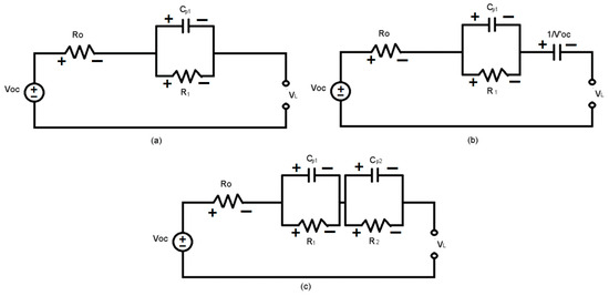 (a) Equivalent first-order Thévenin model; (b) PNGV (Partnership for a New Generation of Vehicles) model with double-layer capacitance; (c) second-order Thévenin model (two R-C pairs). Adapted from Ref. [53].