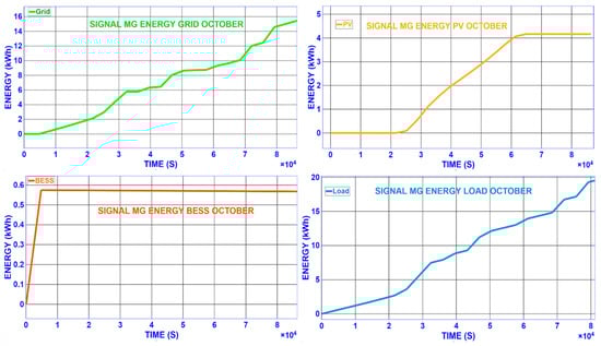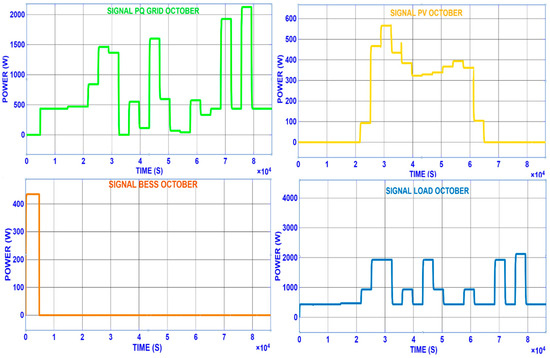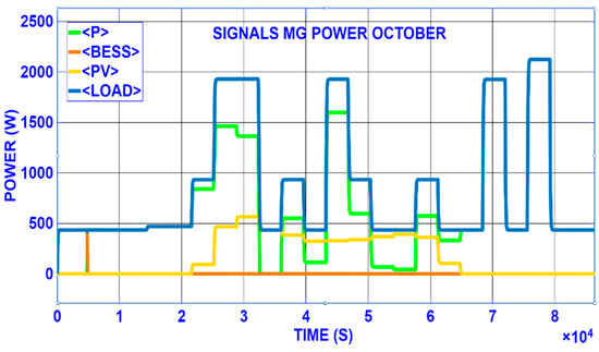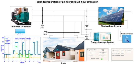 The interconnection infrastructure allows for bidirectional energy transfer between the biomass generator, the photovoltaic system, the storage units, and the domestic load, ensuring operational flexibility and energy balance. To analyse system performance, an energy–time graph is used, where the X-axis represents time in a 24 h cycle, and the Y-axis represents power in watts. The coloured lines indicate the generation signals: biomass (green, PQ_GRID), storage (orange, P_BESS), solar generation (yellow, P_PV), and load demand (blue, P_LOAD).