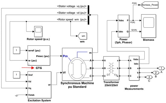 Figure 6 presents a simplified block diagram of the biomass generator, a plant that uses a gas turbine as its central component to generate electrical power. This turbine is connected to a synchronous generation system that converts mechanical energy into electrical energy. The system has an excitation control subsystem, a transformer, and electrical measurements to evaluate its performance. Agricultural biomass waste is used as fuel, promoting a renewable energy source and a circular economy.