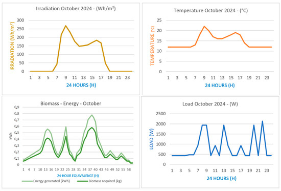 This combination of data is essential for more accurately modelling the performance of energy systems under real weather conditions. Together, these databases enable a contextualised assessment of the energy resources available in the area. In addition, the quantity and availability of biomass (kg/day) were determined from studies on the energy potential of agricultural waste in the region [42], taking into account an average humidity of 15–20% and a calorific value ranging from 3600 to 4200 kcal/kg. To assess renewable generation conditions, combined daily resolution irradiation and temperature data were used [41], which made it possible to characterise the environmental conditions that affect the overall performance of the hybrid microgrid. This information is essential for designing and optimising the operation of the microgrid, maximising the use of renewable resources and adapting to local energy demands with greater precision and efficiency.