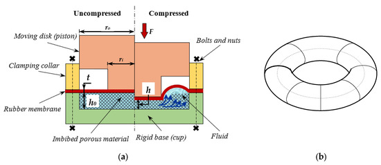 (a) Design configuration of the newly EPHD damper: left—uncompressed, right—compressed; (b) expelled volume—half toroidal.
