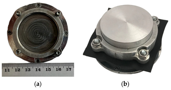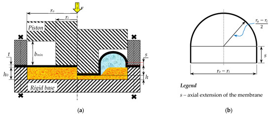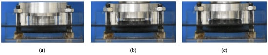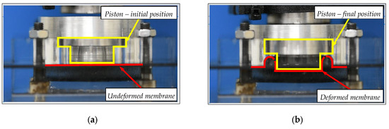 The membrane inflation in the peripheral area of the piston during compression is correlated with the presence of the fluid. Hence, the elastic deformation of the natural rubber membrane under hydraulic pressure is tested using two different incompressible fluids. Figure 5a shows the results of two tests with glycerin and oil, respectively. Due to the fluid’s incompressibility, both experimental curves should have overlapped. The difference between these curves is justified by the unequal volume of the fluid inside the cavity and by the level of stretching and tightening of the rubber membrane when mounted and fixed with the clamping collar.