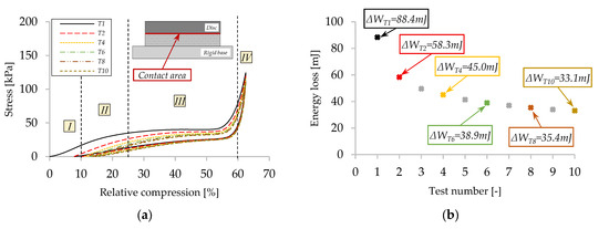Stress-relative compression variation: (a) compression behavior of the dry S3D for 10 consecutive tests; (b) energy loss for 10 consecutive tests on dry S3D.