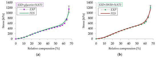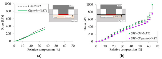 The cumulative effect of the three mechanisms that contribute to device’s performance can be observed in Figure 5b. Here, the compression behavior of EPHD damper using imbibed S3D with glycerin and with oil is presented in average form (for 6 and 10 tests, respectively, performed on different specimens) with the standard deviation included. The average standard deviation calculated for stress is less than 20 kPa for glycerin and 35 kPa for oil, while the maximum deviation appears for relative compression values above 60% (120 kPa for glycerin, 139 kPa for oil). For the same level of compression, stress is slightly higher when using synthetic oil. In addition to the previously mentioned causes (Figure 5a), these differences can also be generated by the tolerances of the porous disk sizes, or by the friction of the membrane and of the piston with solid boundaries.
