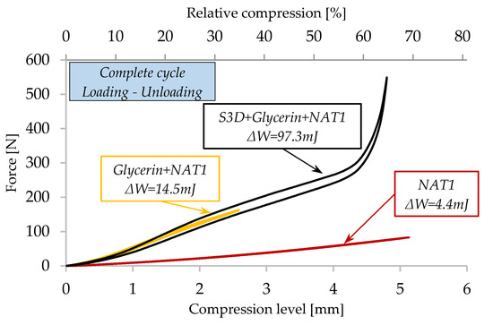 Based on this graph, one can calculate energy losses through hysteresis. When using natural rubber with glycerin imbibed S3D (S3D + glycerin + NAT1), the energy loss is 97.3 mJ. Comparing these results with the results obtained for glycerin + NAT1 without S3D, where the energy loss is 14.5 mJ, and with the results obtained for dry S3D (58.3 mJ—Figure 4a), it is confirmed one more time that the energy loss with the imbibed porous layer increases by 40%.