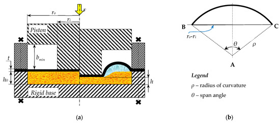 Applying the volume conservation hypothesis to Equation (4), one can obtain the span angle, θ, as a function of compression of the porous material, Δh (for phase 1 of compression), as well as the axial extension, s, in phase 2.