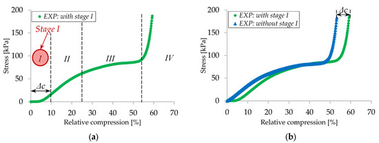 The stress-relative deformation variation for S3D material was analyzed for ten consecutive tests performed on the same S3D specimen (Figure 4a). To evaluate the intensity of the compression, the stress values presented on the graph are obtained using Equation (1):