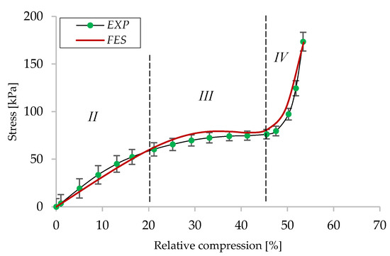 These results confirm the observations reported in similar studies [18] that 3D spacer textiles exhibit four different phases under compression: (I) initial stage, defined by low stress values (due to the compression of loose ends of external faces and middle layer); (II) elastic stage governed by an increase in compression stress; (III) plateau stage with constant stress-relative deformation variation; and (IV) densification stage defined by a fast increase in stress values, resulting in high stiffness. In our experiments, the compression surface defined by the piston is smaller than the diameter of the S3D samples. In this case, the material around the piston generates additional resistance during compression, resulting in higher stresses.