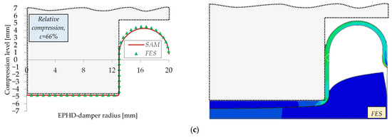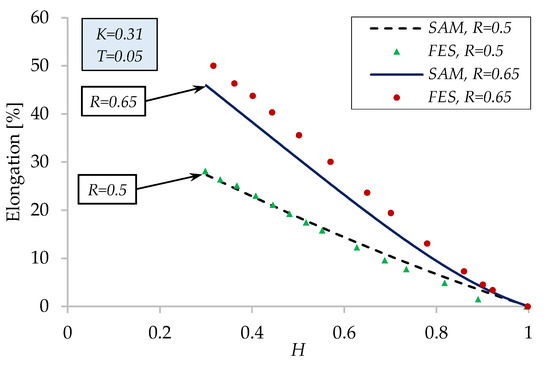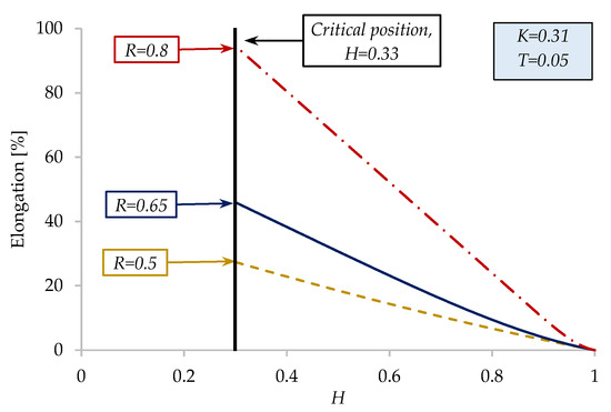 Radius of the piston is another parameter that has an important influence on the EPHD damper. The variation of the relative elongation of the rubber membrane as a function of the dimensionless thickness of the porous material, for different configurations of the piston (given by R), is shown in Figure 24. As expected, for a lower value of R, the relative elongation of the membrane decreases. With the volume of liquid displaced being smaller, the elongation of the membrane is also lower. The opposite situation is also valid. This graph confirms that the maximum relative elongation of the membrane (≈46%), obtained at critical position H = 0.33 (densification limit of the porous material), is included in the range 0–50%, where the membrane has a quasi-linear elongation.