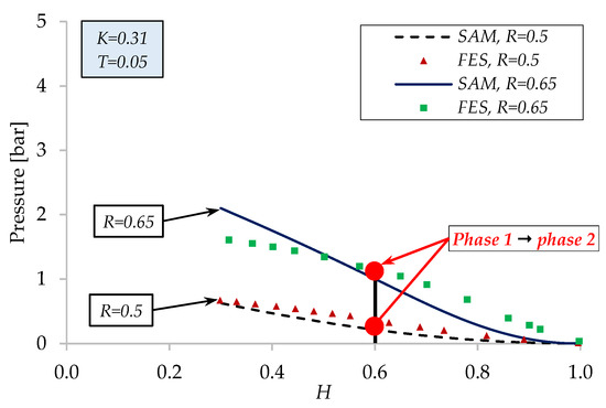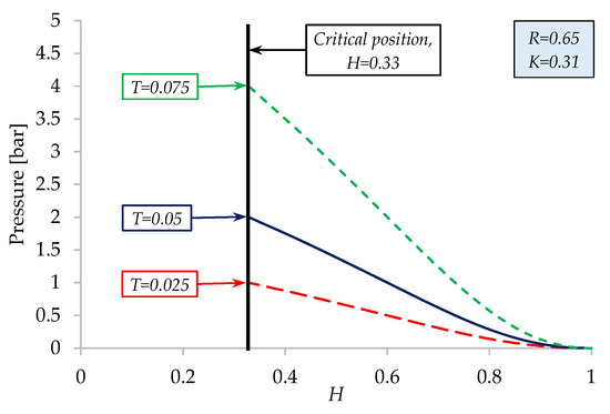 The influence of the membrane thickness on the pressure is presented in Figure 23 for the reference case that was tested experimentally: R = 0.65 and K = 0.31 (shape factor of the porous material). One can see that at the critical level of compression (H = 0.33), the pressure generated by a thinner membrane (T = 0.025) is approximately 50% lower than a membrane with double thickness (T = 0.05). Being less rigid, a thinner membrane offers less resistance to the collection of fluid in the outer annular area of the piston. The greater the thickness, the more resistance it offers during fluid expulsion.