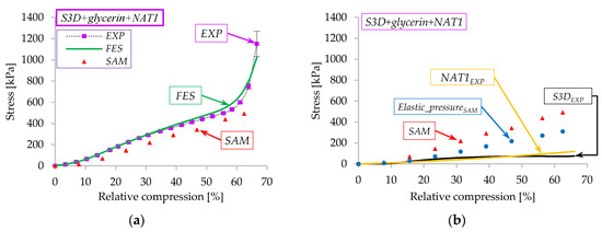 The values of stress using SAM are determined by summing the effects of the three mechanisms for the S3D+glycerin+NAT1 case (Figure 20b). The stress generated by the pressure inside the device (Elastic_pressure_SAM) was determined with SAM, while the deformation of the porous structure (S3DEXP) and of the rubber membrane (NAT1EXP) was taken from experimental data: