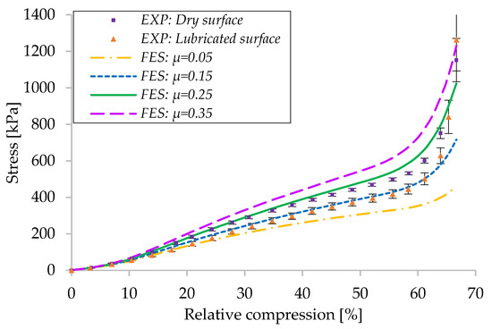 For the two experimental situations analyzed (dry and lubricated contact), the value of COF used in the FE model was obtained through an iterative process. For the dry contact surface, the numerical curve that offers the best approximation uses a COF of 0.25. For the lubricated surface, a value of 0.15 for COF was used. Another two situations, considering COF = 0.05 and 0.35, respectively, were analyzed. From this study, we can see that for the same level of compression, the pressure values obtained are higher when the friction between the two surfaces is more pronounced.