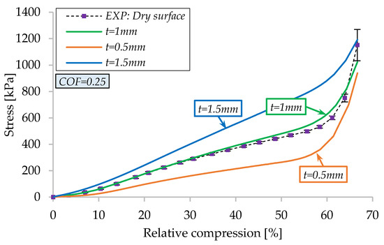 Figure 22 shows the results of numerical simulations showing stress-relative compression variation for three different thickness membranes: t = 0.5 mm, t = 1 mm, and t = 1.5 mm, considering COF = 0.25. The reference thickness is t = 1 mm, which was tested experimentally and for which the numerical model provided good approximation. Using a thinner membrane, t = 0.5 mm, the stress values are 45% lower than the reference case. In contrast, using a thicker membrane, t = 1.5 mm, the evolution is somehow predictable, with stress being 31% higher, when compared to the reference case.