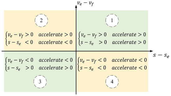 Figure 1. In the first and third quadrants, the deviations in speed and spacing are in the same direction, corresponding to cases of dual acceleration and dual deceleration, respectively. In these situations, the driver’s behavioral decision is relatively straightforward. However, in the second and fourth quadrants, speed and spacing deviations are in opposite directions, requiring the driver to balance between two factors in order to decide whether to accelerate or decelerate.