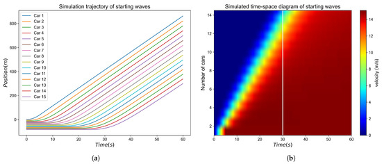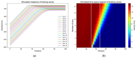 2) until reaching 15 (m/s), after which it maintained a constant speed. The simulation step size was set to 0.1 s. The trajectories and speeds of all vehicles were recorded, and a space–time diagram was plotted (as