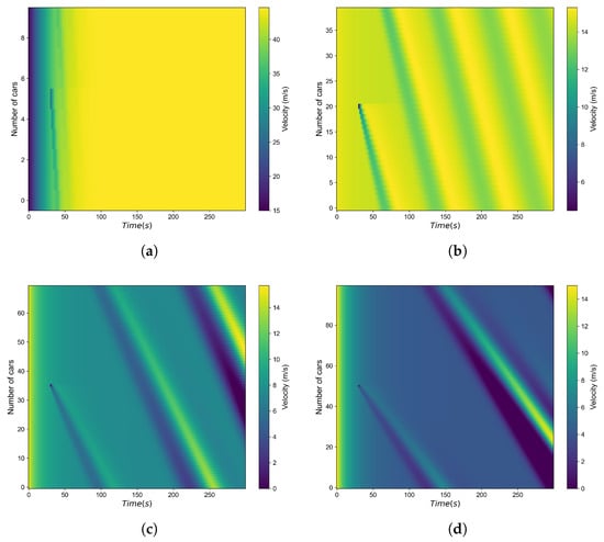To avoid boundary effects on traffic evolution, the simulation environment was set as a single-lane ring road of length L = 1000 (m). By adjusting the number of vehicles N, different density levels were constructed to induce typical three-phase traffic states. Four cases were tested with and 100, representing sparse to high-density traffic. The simulation step size was = 0.1 (s), and the total simulation time was = 300 (s). Initially, vehicles were uniformly distributed with a speed of 15 (m/s). At t = 30 (s), one middle vehicle suddenly decelerated by 10 (m/s) to trigger a disturbance.