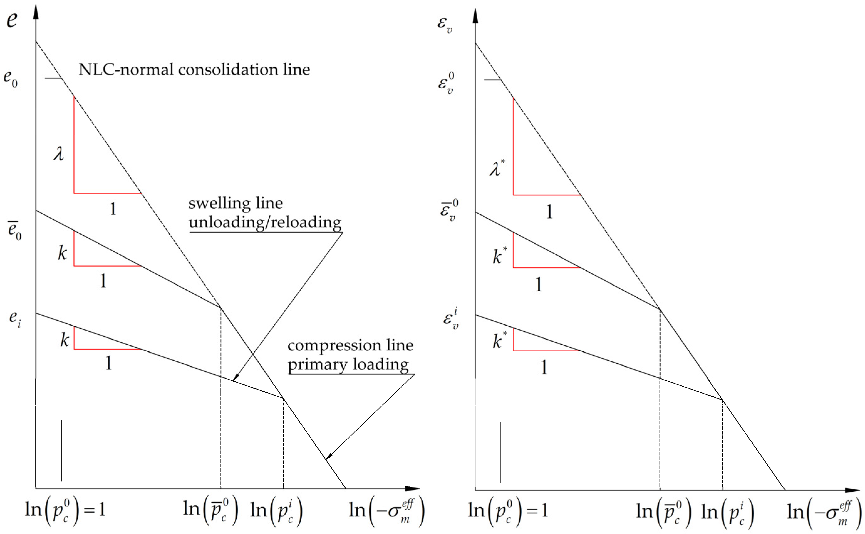The Modified Cam-Clay (MCC) model was initially formulated for triaxial loading conditions. Experimental observations on soft clays provided the basis for the constitutive relationship describing the evolution of the void ratio e (volumetric strain) as a function of the logarithm of the effective mean stress σ m e f f , as illustrated in Figure 2. The relationship between the two plots is expressed as follows: